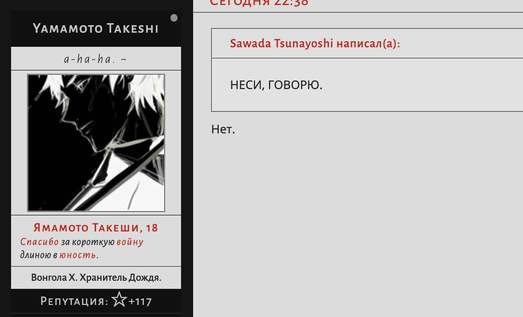 Или тогда, когда впервые встретил Скуало? «Оказывается, я совершенно не умею проигрывать», говорит в тот момент Ямамото, и дни теряют счёт. Это правда — он не умеет и не любит проигрывать. Правда — он хотел взять реванш. Но правда и в том, что что-то вскипает в груди, когда клинки сталкиваются, когда чувствует вкус крови во рту и запах её на чужих руках. Он хотел доказать себе, что способен заставить Дождь Варии воспринимать себя всерьёз. Он не хотел признавать, но чувствовал: рукоять катаны слишком хорошо лежит в руках, как будто так и должно было быть всегда, как будто она — его продолжение. Он оттачивал одно движение за другим, жадно впитывал техники, что показывал ему отец, и день с ночью потеряли всякие границы, обращаясь единым.